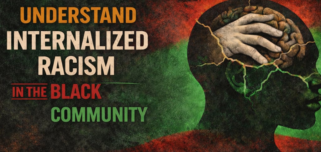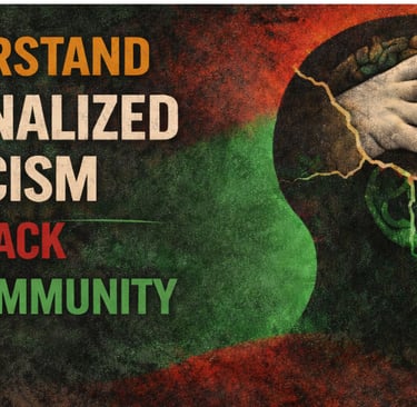 Internalized racism occurs when Black people absorb anti Black beliefs from society and turn them inward against themselves and one another. This process harms mental health, fractures families, and weakens collective power.
