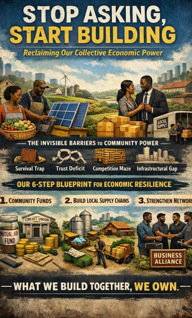 This Strategic Briefing, titled "Stop Asking, Start Building," is a direct response to a viewer’s question regarding community self-reliance and economic independence. It serves as both a strategic analysis and a practical roadmap for moving beyond political activism into tangible community building. The post is structured into three main parts: The Problem: It validates the frustration of relying on external systems that are often cut or dismantled, arguing that true freedom requires economic self-determination. The Barriers: It identifies four psychological and structural hurdles—the Survival Trap, the Trust Deficit, the Competition Maze, and the Infrastructural Gap—that prevent communities from unifying. The Solution: It provides a 6-step "Activation Blueprint" divided into three phases: establishing mutual aid funds, redirecting capital to local credit unions, and formalizing bartering networks and business alliances. Overall, the post is designed to shift the reader's mindset from a passive consumer waiting for outside help to an active builder of a "Circular Community Economy."